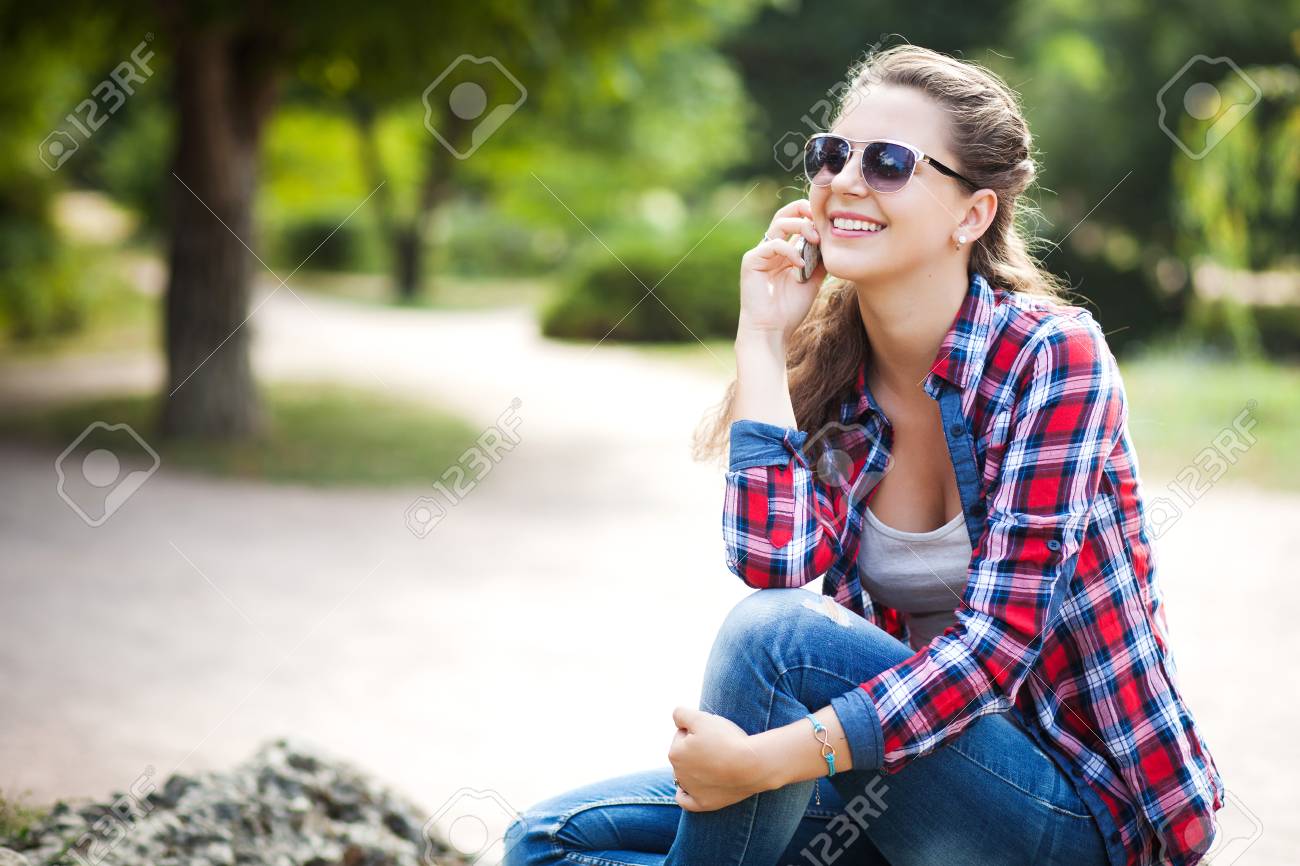 Mujer Bonita Joven Hablando Por Perfil De Teléfono Móvil, En El Parque De Otoño. Fotos, Retratos, Imágenes Y Fotografía De Archivo Libres De Derecho. Image 77739341.